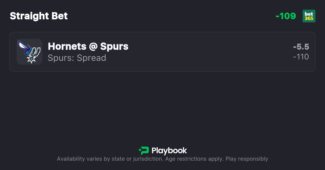 The Spurs are 5.5-point favorites over the Hornets on the spread (Spurs -5.5), with the over/under set at 229 total points. San Antonio is a -245 favorite to win outright on the moneyline, while Charlotte is +200 to pull off the upset.