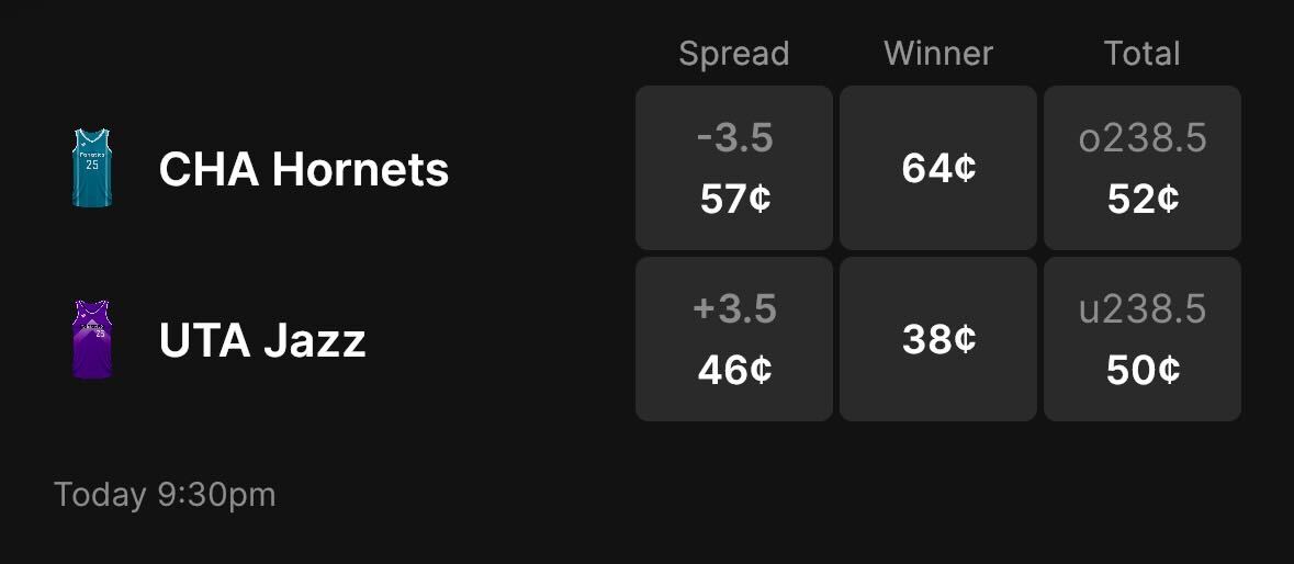 The Hornets are 3.5-point favorites over the Jazz on the spread (Hornets -3.5), with the over/under set at 238.5 total points. Charlotte is a 64-cent favorite to win outright, while Utah is priced at 38 cents to pull off the upset on Fanatics Markets.