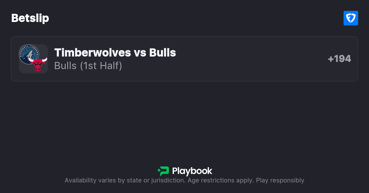 • Bulls vs Timberwolves pick: Bulls First Half Moneyline (+194)