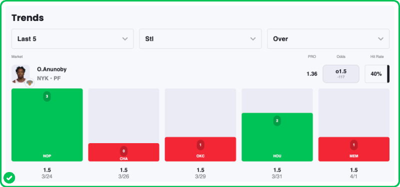 I tend to target OG Anunoby defensive props more than other Knicks' players in these spots. He’s always a candidate to go off in the steals department.