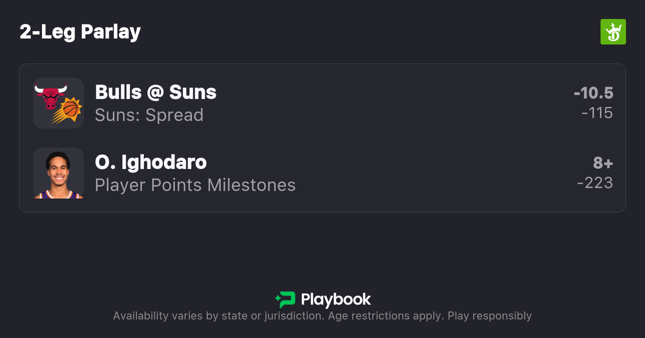 My Suns vs. Bulls best bet is a same game parlay combining Phoenix to cover the spread and Oso Ighodaro to record 8+ points. Make sure to find the best odds by checking our live NBA odds page.