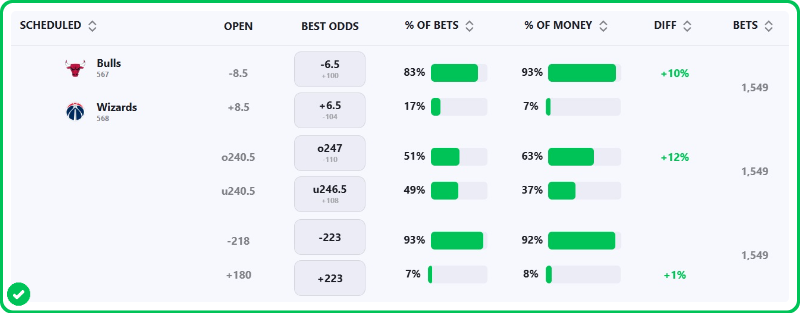 The Bulls are 6.5-point favorites over the Wizards on the spread (Bulls -6.5), with the over/under set at 247.5 total points. Chicago is a -260 favorite to win outright on the moneyline, while Washington is +210 to pull off the upset.