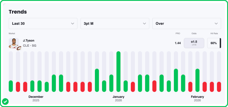 - Jaylon Tyson Over 1.5 Three-Pointers Made (+110)
