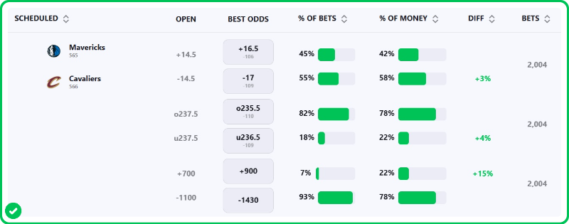 This Over/Under system targets NBA regular-season games, such as this Mavericks-Cavaliers matchup, where betting action and market movement are misaligned.