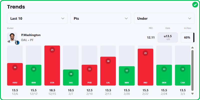 Pick: P.J. Washington Under 13.5 Points (-125, bet365)