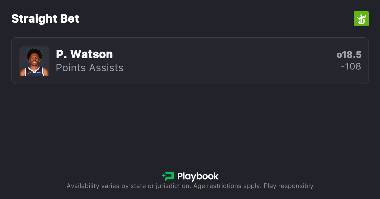 - Nuggets vs Knicks pick: Peyton Watson Over 18.5 Points & Assists (-108)