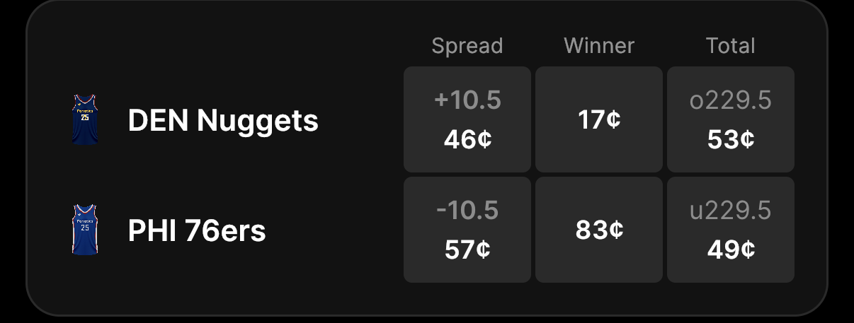The Sixers are 15-point favorites over the Nuggets on the spread (76ers -15), with the over/under set at 228 total points. Philadelphia is an 83-cent favorite to win outright, while Denver is priced at 17 cents to pull off the upset on Fanatics Markets.