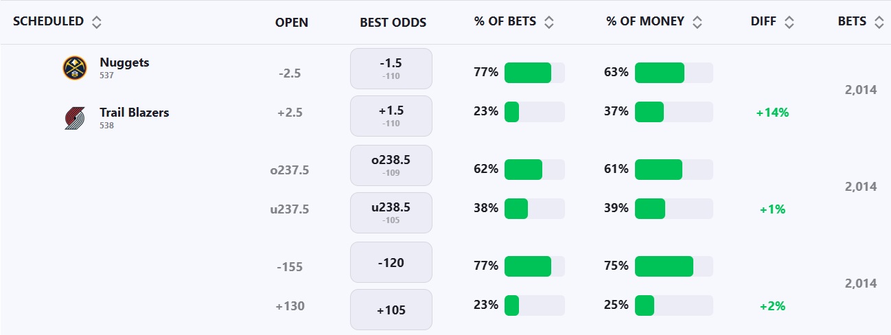 The Nuggets are 1.5-point favorites over the Blazers on the spread (Nuggets -1.5), with the over/under set at 238.5 total points. Denver is a -120 favorite to win outright on the moneyline, while Portland is +102 to pull off the upset.