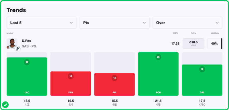 - Nuggets vs Spurs pick: De'Aaron Fox Over 18.5 Points (-107)