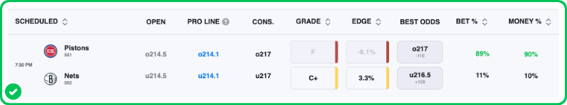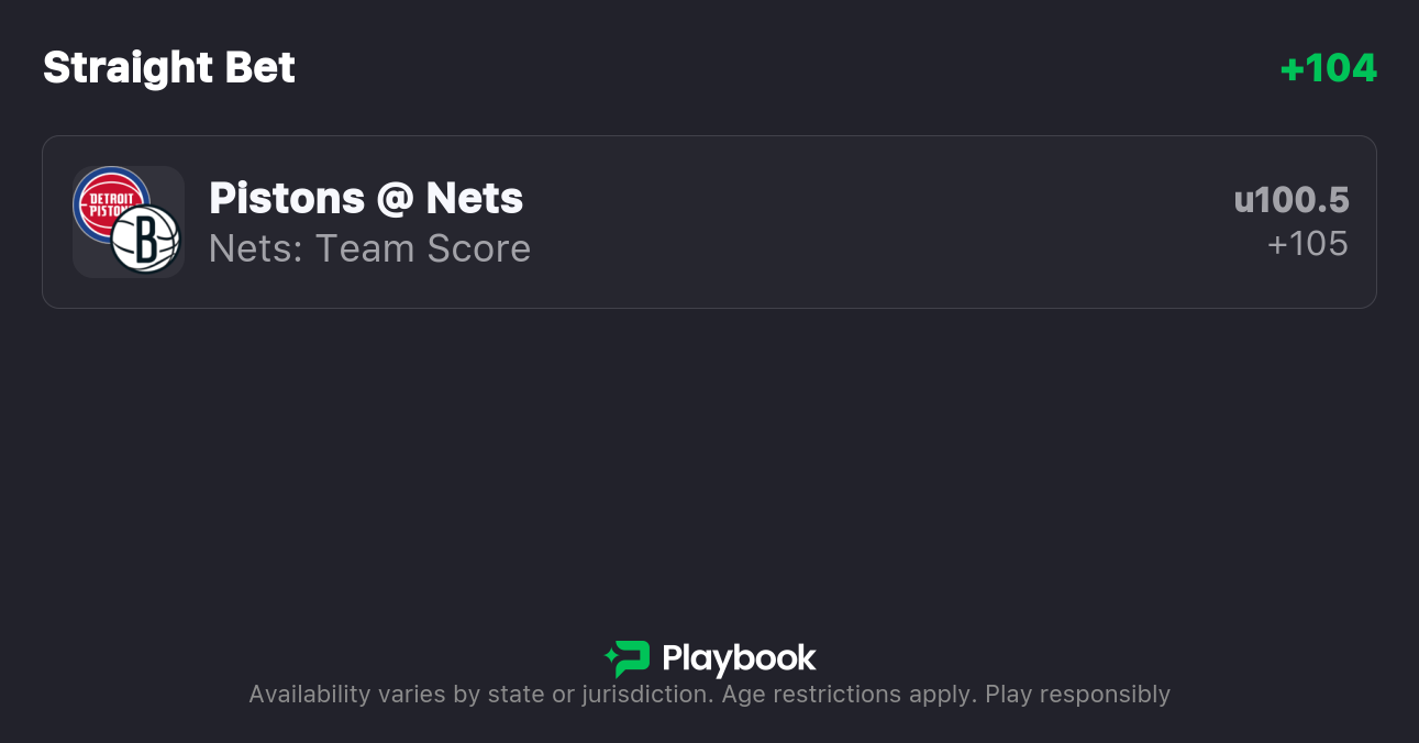 - Pistons vs Nets pick: Nets Team Total Under 100.5 (+105)