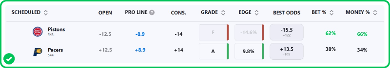 Our PRO Projections mark this Pacers spread with an A grade, offering a solid 9.8% edge on the market price.