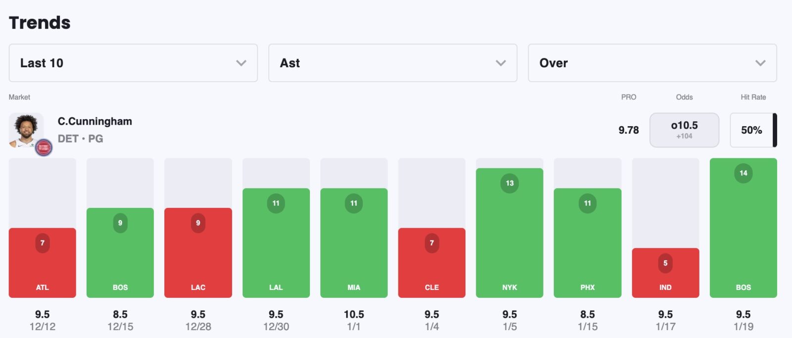 Cunningham has 22 double-doubles in 36 games this season. He may soon be averaging one as he is at 9.8 assists per game this season. He is averaging 11.2 assists per game over his last 10 games, and he has had 10 or more in seven of those games.