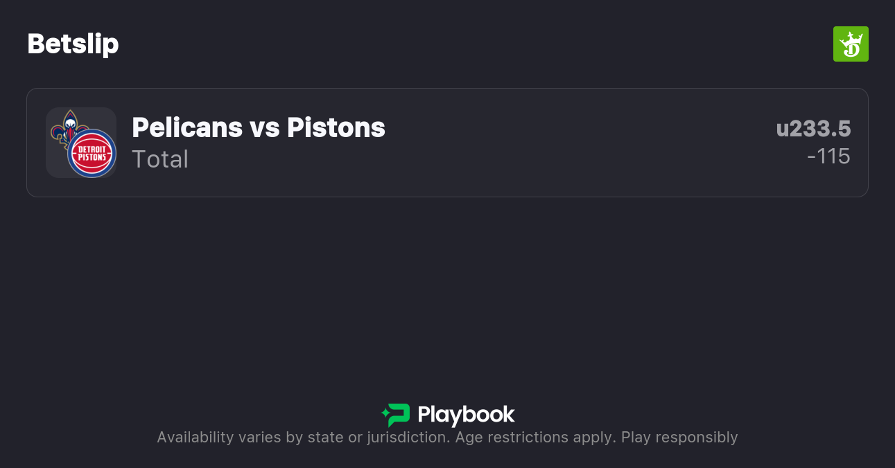 - Pistons vs Pelicans pick: Under 231.5 (-110)