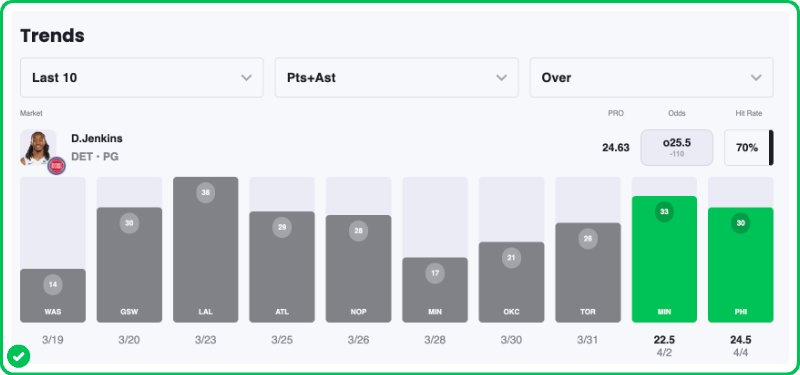 Daniss Jenkins has combined for 25+ points & assists in seven of his last nine games, with the only two unders coming in really tough matchups against the Thunder and Timberwolves (1st and 5th ranked defenses in the league).