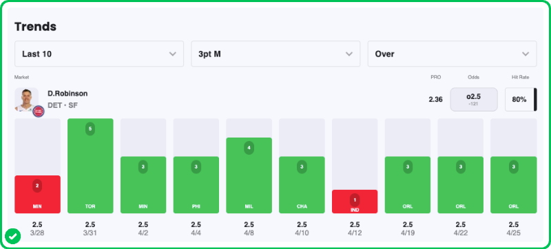 Game 3 is notoriously the weak-spot for favorites on the road, but in Game 4, you need your role players to provide functional offense. Robinson is perfect in that role. I’ll back him to make over 2.5 three-pointers tonight.