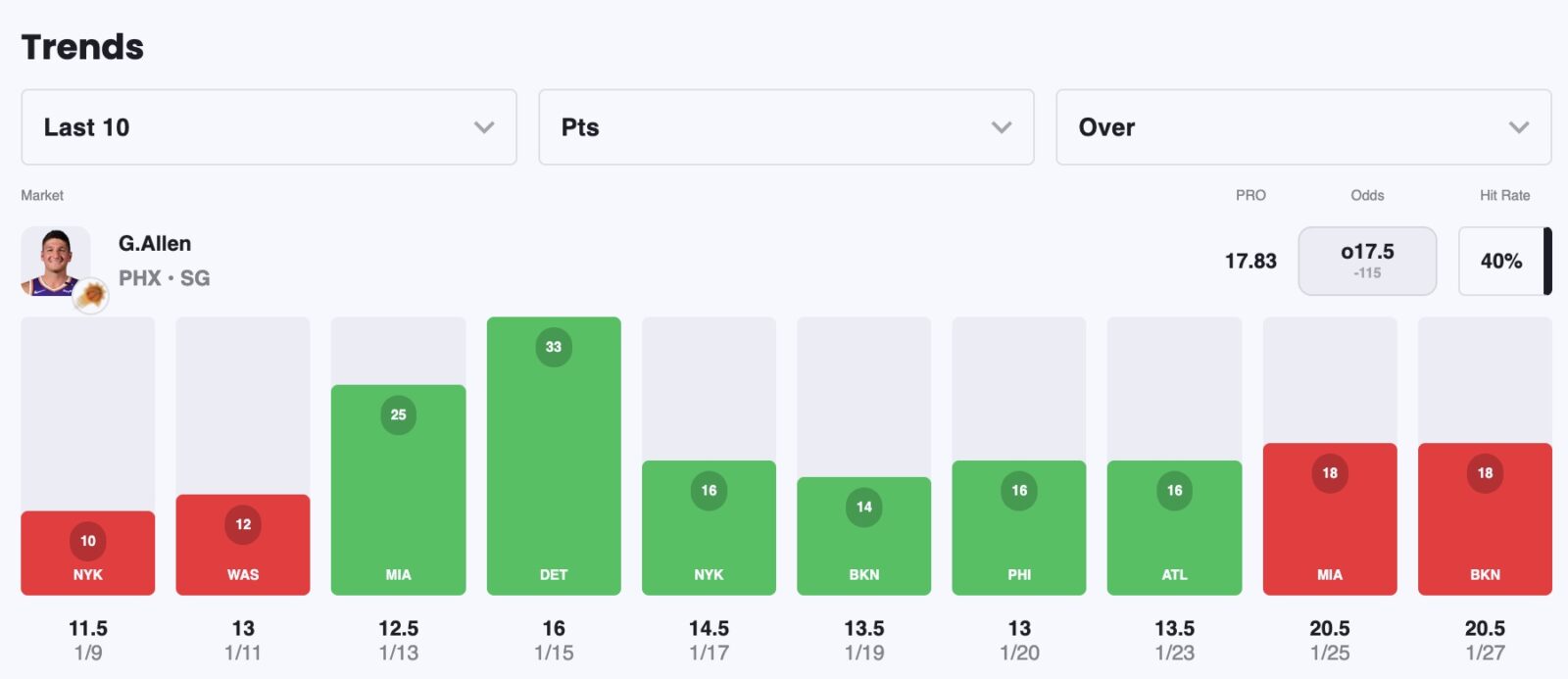 Allen has cashed this prop in seven of his last eight games and has averaged 16.4 points per game this month.