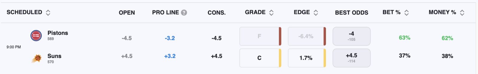 The Pistons are 4.5-point favorites over the Suns on the spread (Pistons -4.5), with the over/under set at 214.5 total points. Detroit is a -175 favorite to win outright on the moneyline, while Phoenix is+145 to pull off the upset.