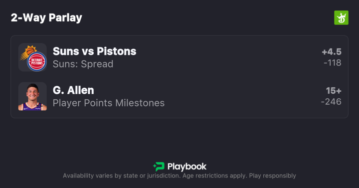 - Pistons vs Suns pick: Suns +4.5 / Grayson Allen 15+ Points (+128)