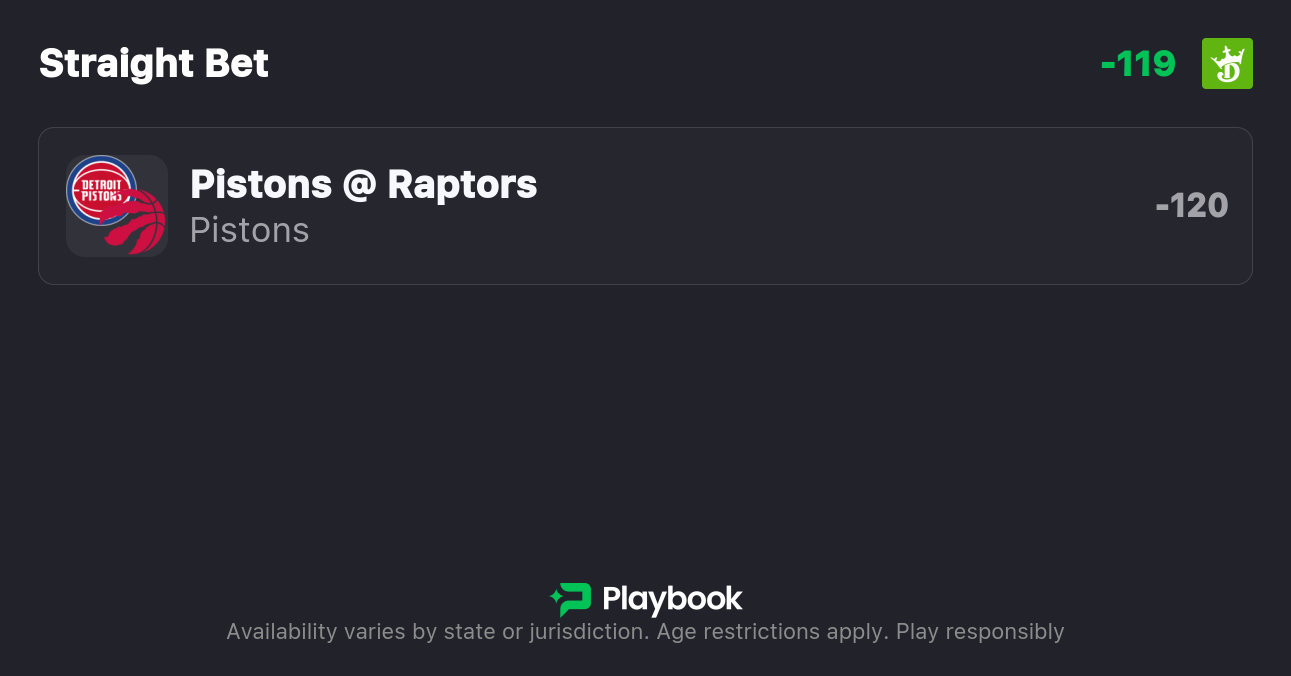 - Pistons Moneyline (-120, DraftKings)