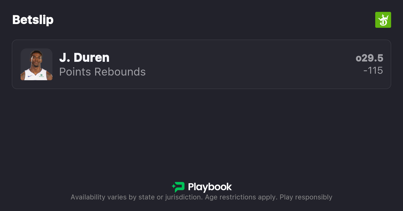 Pick: Jalen Duren Over 29.5 Points + Rebounds (-115, DraftKings)