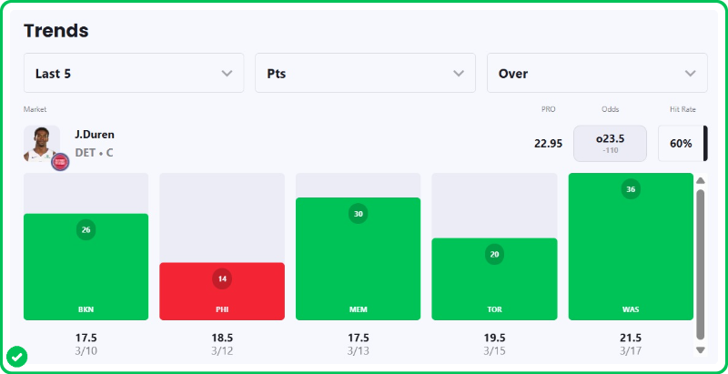 - Pistons vs Wizards pick: Jalen Duren Over 23.5 Points (-108)