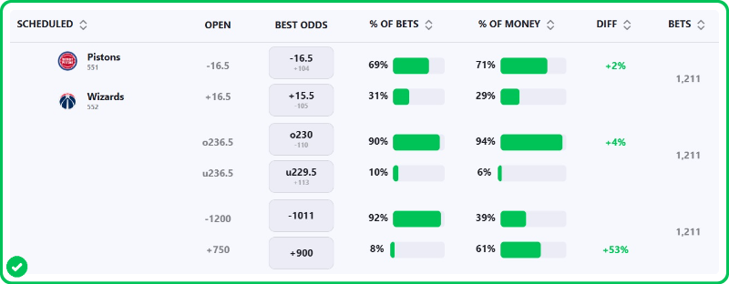 The Pistons are 16-point favorites over the Wizards on the spread (Pistons -16), with the over/under set at 229.5 total points. Detroit is a -1200 favorite to win outright on the moneyline, while Washington is +750 to pull off the upset.