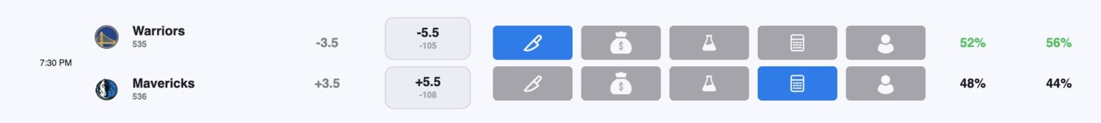 The Warriors are 4.5-point favorites over the Mavericks on the spread (Warriors -4.5), with the over/under set at 232.5 total points. Golden State is a -185 favorite to win outright on the moneyline, while Dallas is +155 to pull off the upset.