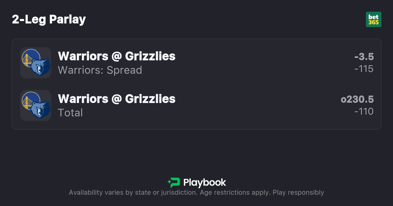 The Warriors are 3.5-point favorites over the Grizzlies on the spread (Warriors -3.5), with the over/under set at 230.5 total points. Golden State is a -180 favorite to win outright on the moneyline, while Memphis is +150 to pull off the upset.