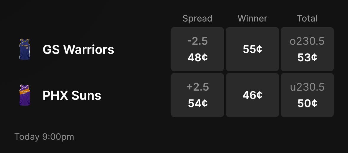 The Warriors are -2.5 favorites over the Suns on the spread (Warriors -2.5), with the over/under set at 230.5 total points. Golden State is a 55-cent favorite to win outright on the moneyline, while Phoenix is priced at 46 cents to pull off the upset on Fanatics Markets.