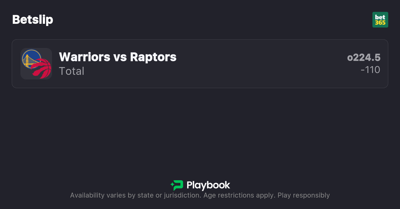 My Raptors vs Warriors best bet is Over 224.5 total points in this game, with the best price currently available at bet365. But as always, make sure to find the best odds by checking our live NBA odds page.
