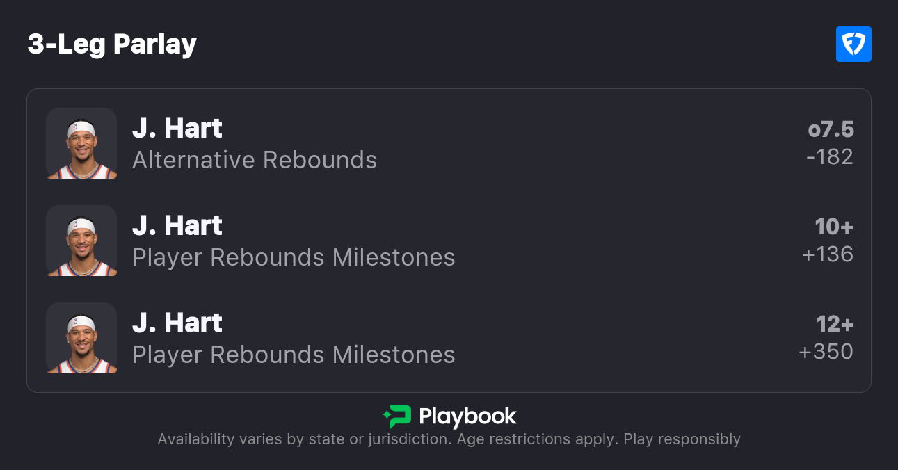 Josh Hart Over 7.5 Rebounds (-150) | 10+ (+124) | 12+ (+320)