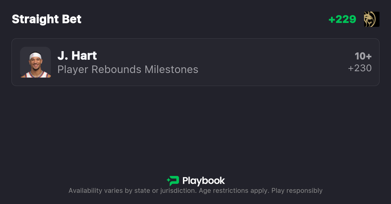 We are officially back in the playoff lab, where logic goes to die and Josh Hart plays essentially the entire game for the Knicks. So, for my Game 2 best bet, I’m ignoring the standard lines and going straight to the alt-market: Josh Hart to record 10+ Rebounds at +300 via BetMGM.