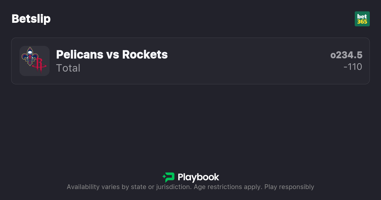 - Rockets vs Pelicans pick: Over 234.5 (-110)