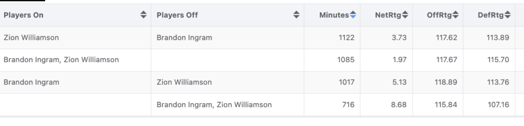 But Ingram remains in New Orleans, despite no extension deal being reached. Ingram had his best playmaking season of his career last season. He genuinely looked for Williamson consistently and the team was better with him on the floor. But look at these splits for the two of them: