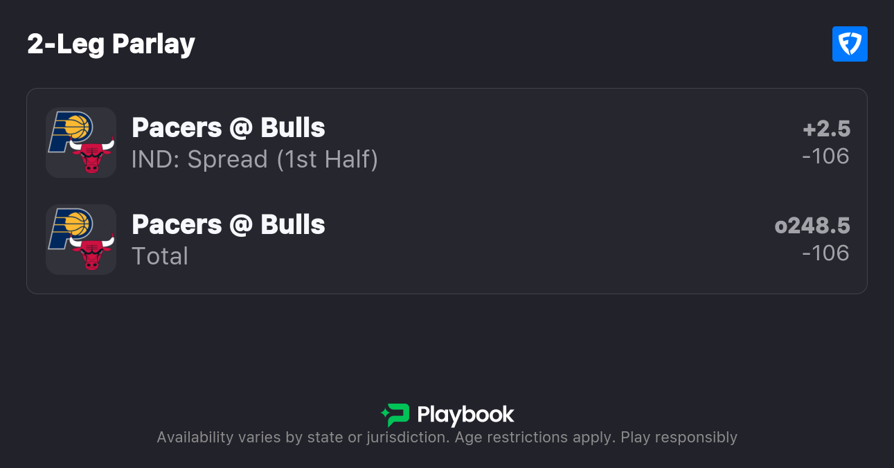 - Pacers vs Bulls picks: Pacers First Half Spread +2.5 (-115), Over 248.5 (-110)