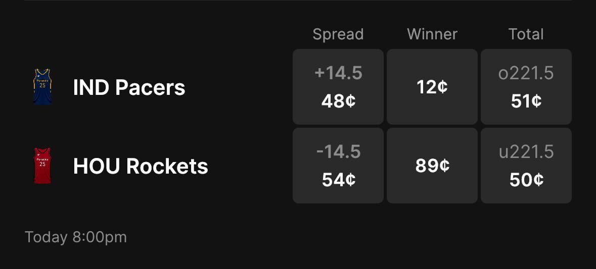 The Rockets are 15.5-point favorites over the Pacers on the spread (Rockets -15.5), with the over/under set at 221.5 total points. Houston is a 89-cent favorite to win outright on the moneyline, while Indiana is priced at 12 cents to pull off the upset on Fanatics Markets.