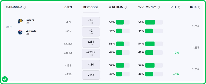 The Pacers are 2-point favorites over the Wizards on the spread (Pacers -2), with the over/under set at 231 total points. Indiana is a -130 favorite to win outright on the moneyline, while Washington is +110 to pull off the upset.