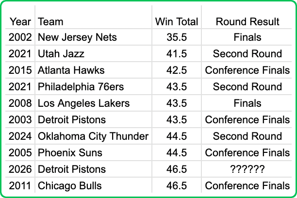 Detroit also far exceeded expectations relative to its preseason outlook. The Pistons entered the year with a win total of 46.5 and finished with 60 wins, clearing that number by 13.5 games.