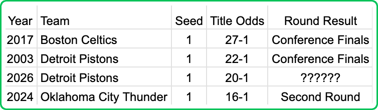 None of those teams reached the NBA Finals. Both the Celtics and Pistons lost in the Conference Finals, while the Thunder were eliminated in the second round. That places the 2026 Pistons in a historically precarious tier, a top seed in standings, but not in market expectation.