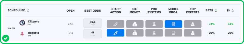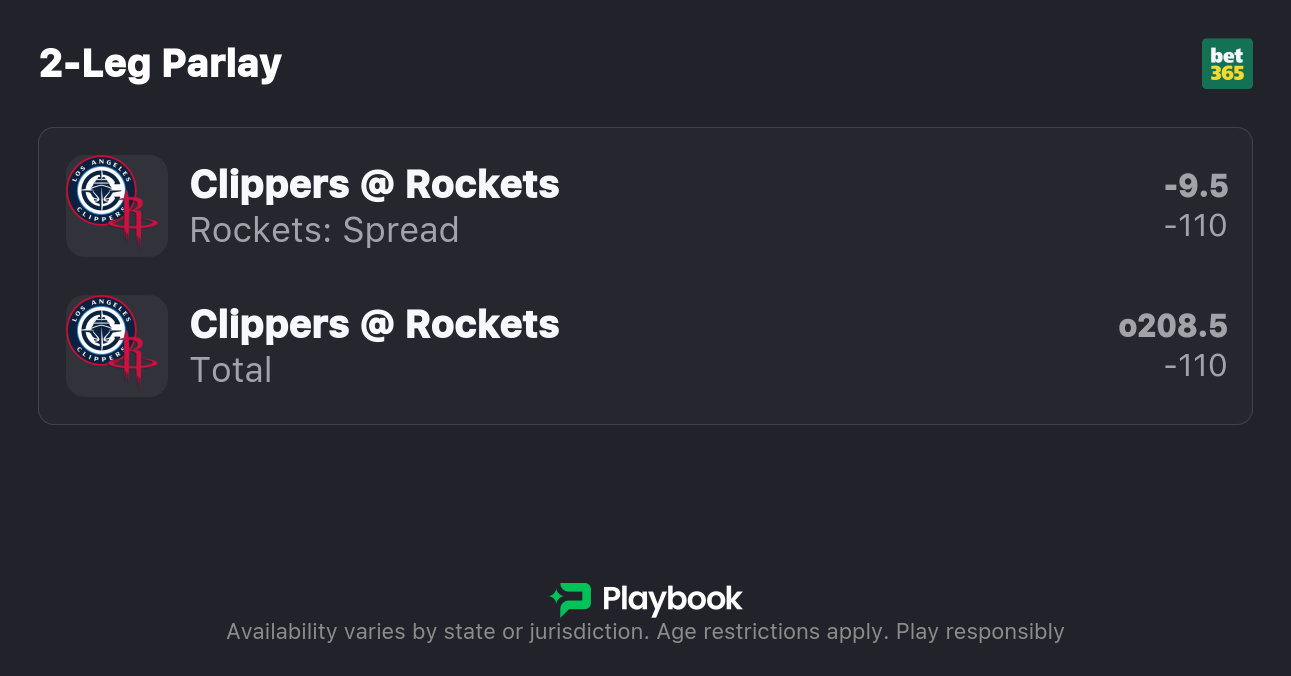 The Rockets are 9.5-point favorites over the Clippers on the spread (Rockets -9.5), with the over/under set at 208.5 total points. Houston is a -370 favorite to win outright on the moneyline, while Los Angeles is +290 to pull off the upset.