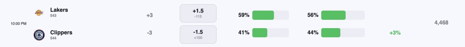 The Clippers are 1-point favorites over the Lakers on the spread (Clippers -1), with the over/under set at 223.5 total points. The Clippers are -115 favorites to win outright on the moneyline, while the Lakers are -105 to pull off the upset.