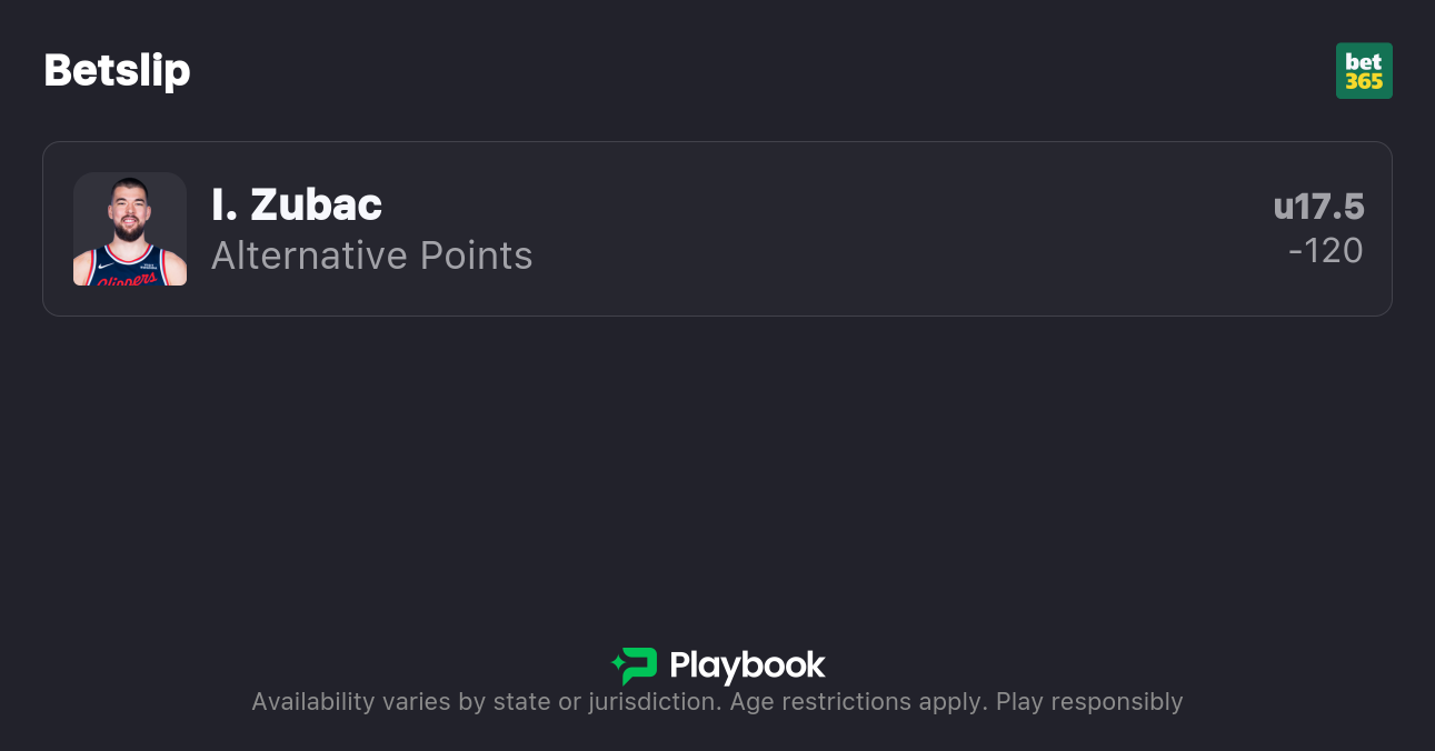 - Ivica Zubac Under 17.5 Points (-120, bet365)