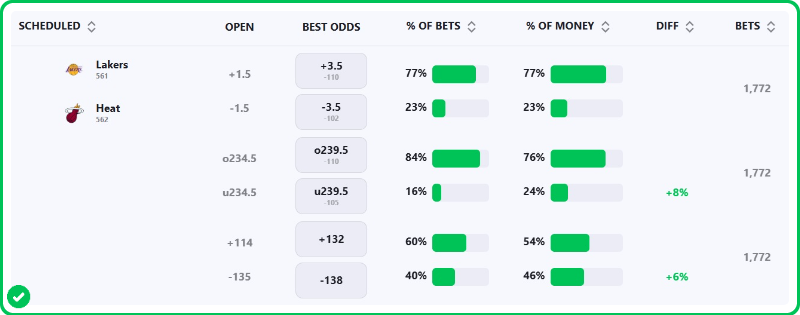 The Heat are 2.5-point favorites over the Lakers on the spread (Heat -2.5), with the over/under set at 239.5 total points. Miami is a -155 favorite to win outright on the moneyline, while Los Angeles is +130 to pull off the upset.