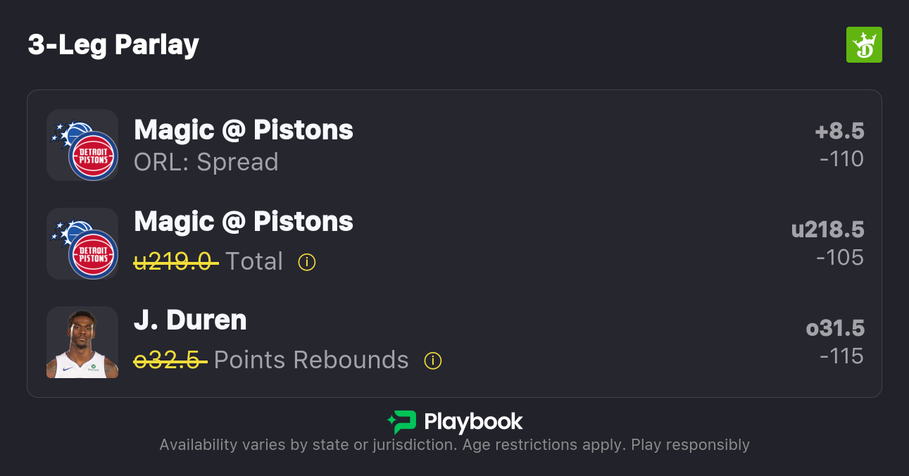 The Pistons are 8.5-point favorites over the Magic on the spread (Pistons -8.5), with the over/under set at 219 total points. Detroit is a -375 favorite to win outright on the moneyline, while Orlando is +295 to pull off the upset.
