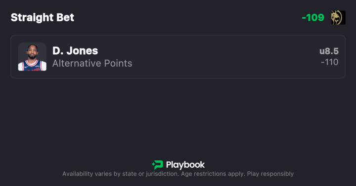 With our model projecting him well below the market line and his recent production trending down, there's solid value in backing Jones to stay under 8.5 points in tonight’s game against the Mavericks.