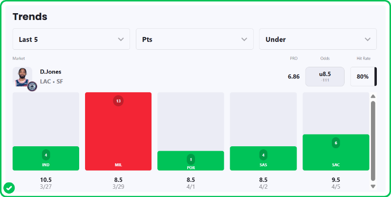 Derrick Jones Jr. is averaging 10.3 points per game this season with the Clippers, although his recent form suggests a clear downward trend. He has stayed under this line in four of his last five games, posting totals of 6, 4, 1 and 4 points.