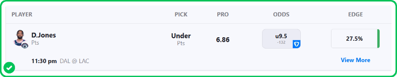 Action PRO is projecting Jones for 6.86 points in the Mavericks’ matchup against the Clippers tonight, presenting a strong 24.7% edge against the market compared to his current prop line of over/under 8.5, which is good enough to tag the Under with an A+ grade in our system.