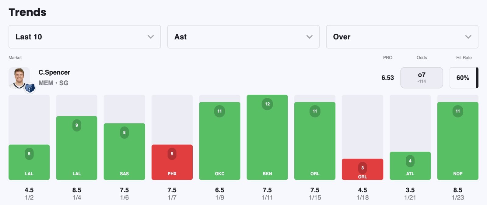 The Rockets present a tougher matchup, allowing the 10th-fewest assists to point guards, but I still like Spencer to record at least seven assists tonight, a mark he's reached in nine of his last 10 games without Morant.