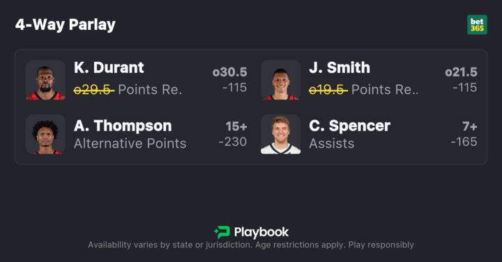 I like Durant for 30 points + rebounds and Smith for 20 points + rebounds, as this matchup should benefit both.