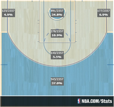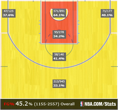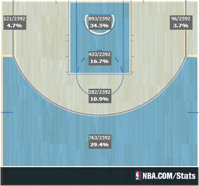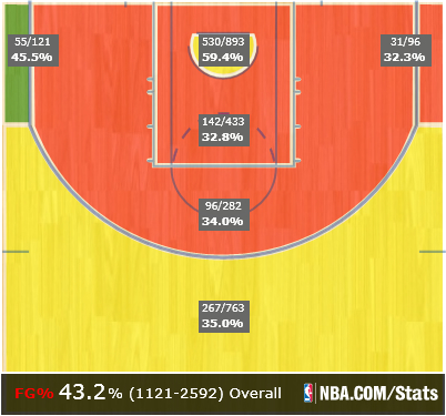 Miami is a effectively pretty similar team to Houston in its shot selection, if not as zealous in its pursuit of statistical efficiency perfection. The Heat are just much worse on drives, and the shots where they don't commit to that Houston approach are where they suffer.